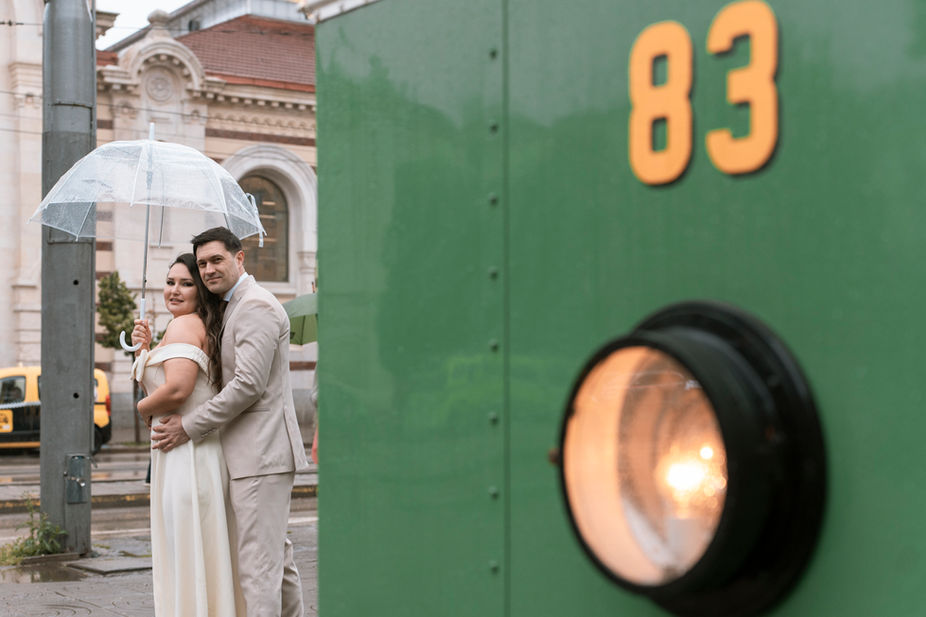 Вятърът си играеше с роклята ѝ, капките целуваха лицата им, а трамваят на времето мина покрай тях, сякаш казваше: „Запомнете този миг.“ Любовта им стопли деня. А градът — свидетел на хиляди истории — записа още една. Истинска. Романтична. Вечна.